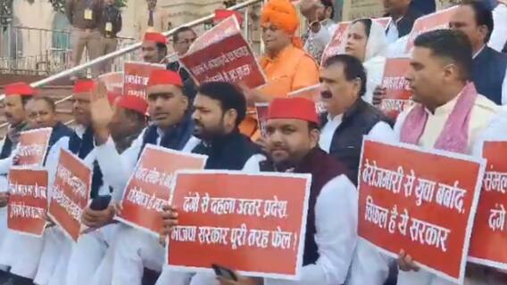 Samajwadi Party leaders held a protest outside the Uttar Pradesh Legislative Assembly on Monday the first day of its winter session. The leaders of the opposition party sat with posters protesting against several issues including paper leaks and violence in Sambhal.