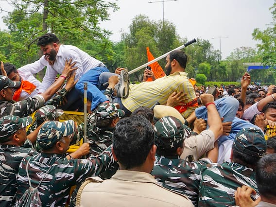 Akhil Bharatiya Vidyarthi Parishad activists protested near the official residence of Delhi Chief Minister Arvind Kejriwal Tuesday accusing his government of being "negligent" in implementing fire safety measures at coaching centres of the city. A fire had broken out at a building housing coaching institutes in northwest Delhi's Mukherjee Nagar area on June 15. Students of coaching institutes smash windows, climbed down ropes and took the help of ladders in desperate attempts to escape the blaze.
