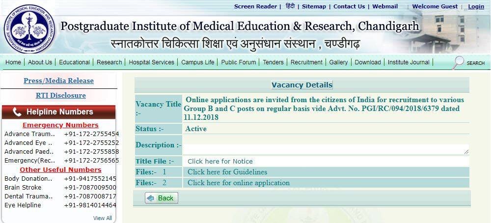 PGIMER Chandigarh Recruitment 2018: The Post Graduate Institute of Medical Education and Research, Chandigarh has notified on the official website pgimer.edu.in about 99 vacancies for various posts including Stenographer, Junior Technician, Assistant Administrative Officer and other Group B and Group C vacancies for which online application window will be open till on 8th January 2019, 11:59 pm. PGIMER Chandigarh Recruitment 2018 - Vacancy Details: Group ‘B’ Posts: Junior Technician (Lab) - 62 Posts Junior Technician (X-ray) - 11 Posts Assistant Administrative Officer - 5 Posts Perfusionist - 3 Posts Junior Speech Therapist - 2 Posts Group ‘C’ Posts: Stenographer - 15 Posts Animal Keeper - 1 Post Eligibility Criteria: Academic Qualification: Assistant Administrative Officer – The applicant must be holding a degree of a recognized university or its equivalent. The applicant should possess 5 years of experience as Superintendent or in equivalent posts and working knowledge of Govt. rules and regulation. Junior Technician (Lab) – The applicant must have completed B Sc. Medical Lab Technology, or B Sc. with diploma in Medical Lab Technology. Junior Technician (X-ray) – The applicant must possess B.Sc. Medical Technology (X-ray) / B.Sc. Medical Technology Radiology / B.Sc. Medical Technology Radiodiagnosis / B.Sc. Medical Technology Radio-diagnosis & Imaging Technology. Junior Speech Therapist –The applicant must have completed B.Sc. Speech and Hearing from a recognized University/Institution. Perfusionist – The applicant must be holding B.Sc. Degree from a recognized University. The applicant should possess a certificate in Perfusion Technology (awarded by recognized Institution/ Association/Authority (such as Association of Thoracic and Cardio Vascular Surgeons of 3 India) after a training in a centre with atleast one year experience in Clinical Perfusion. Stenographer – The applicant must have passed class 12th or should possess equivalent qualification from a recognized Board or University. The applicant’s dictation should be at the speed of 80 w.p.m. in Stenography (English or Hindi) with transcription time of 50 minutes (English) or 65 minutes (Hindi) on computer. Animal Keeper - The applicant must have passed Matric with Science from recognized Board/University. The applicant should possess 2 years’ experience in breeding and keeping of animals preferably in a medical or research Institution. Age-Limit: For the post of Assistant Administrative Officer, the age of applicant should be up to 40 years. For other posts, the applicant must fall in the age bracket of 18 to 30 years. Age-relaxation rules apply as stated in the official advertisement given below. Selection Process: Candidates will be selected on the basis of merit in written examination which will be conducted in English language only. How to apply for PGIMER Chandigarh Recruitment 2019 Group B/C Posts? Step 1 – Visit the official website – pgimer.edu.in Step 2 – Click on ‘Recruitment’ tab Step 3 – Click on ‘Online applications are invited from the citizens of India for recruitment to various Group B and C posts on regular basis vide Advt. No. PGI/RC/094/2018/6379 dated 11.12.2018 ’ Step 4 – Click on Click here for online application Step 5 – Register yourself Step 6 – Login to your profile, fill online application, update challan details, upload photograph & other documents to complete the application process Step 7 – Download the confirmation page and take a printout for further reference Direct Link - http://pgimer.edu.in/PGIMER_PORTAL/PGIMERPORTAL/home.jsp Application Fee: Applicants need to pay an application fee of Rs 1000/- to pursue their application.