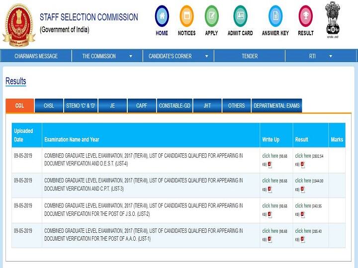 SSSC CGL 2017 Result: The Staff Selection Commission (SSC) has released the SSC Combined Graduate Level (CGL) Exam 2017 (Tier III) result last evening i.e. on 9th May 2019 at ssc.nic.in. The results were declared after the Hon’ble Supreme Court of India lifted the stay order on declaration of result earlier in the day, yesterday. Bringing in a sigh of relief to lacs of candidates who had appeared for the SSC CGL Examination 2017, the Commission has released lists of qualified candidates who are now eligible to appear for the next round of recruitment process viz: Document Verification for the post of A.A.O. (Assistant Audit Officer) – 3082 Qualified Document Verification for the post of J.S.O. (Junior Statistical Officer) – 3804 Qualified Document Verification and C.P.T. – 19,349 Qualified Document Verification and D.E.S.T. – 35,674 Qualified How to check SSC CGL 2017 (Tier III) Result? Candidates who were awaiting the SSC CGL 2017 result can follow the steps below to download their result pdf now: Step 1 – Visit the official website – https://ssc.nic.in/ Step 2 – Click on the ‘Results’ tab from the top menu bar Step 3 – Click on CGL tab, and then click on the pdf icon given in front of the list you wish to check viz: COMBINED GRADUATE LEVEL EXAMINATION, 2017 (TIER-III), LIST OF CANDIDATES QUALIFIED FOR APPEARING IN DOCUMENT VERIFICATION FOR THE POST OF A.A.O. (LIST-1) COMBINED GRADUATE LEVEL EXAMINATION, 2017 (TIER-III), LIST OF CANDIDATES QUALIFIED FOR APPEARING IN DOCUMENT VERIFICATION FOR THE POST OF J.S.O. (LIST-2) COMBINED GRADUATE LEVEL EXAMINATION, 2017 (TIER-III), LIST OF CANDIDATES QUALIFIED FOR APPEARING IN DOCUMENT VERIFICATION AND C.P.T. (LIST-3) COMBINED GRADUATE LEVEL EXAMINATION, 2017 (TIER-III), LIST OF CANDIDATES QUALIFIED FOR APPEARING IN DOCUMENT VERIFICATION AND D.E.S.T. (LIST-4) Step 4 – a pdf will open, CTRL+F with your Roll Number Step 5 – Download the pdf and save it for future reference Direct link to check SSC CGL 2017 (Tier III) Result The Staff Selection Commission has also released tentative vacancies list for SSC CGLE 2017. The Apex Court had put a stay on declaration of results earlier due to alleged paper leak of SSC CGL Exam 2017. A bench comprising Justice S.A. Bobde and S.A. Nazeer had lifted the stay order yesterday, read more: SSC CGL 2017 Exam Paper Leak Case: SC removes stay order