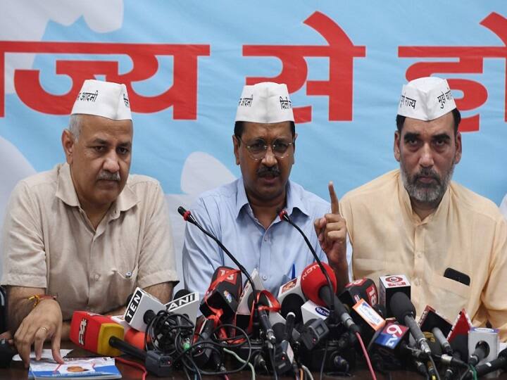 FILE - Chief Minister of Delhi Arvind Kejriwal (C) gestures while talking to the media as Deputy Chief Minister of Delhi Manish Sisodia (L) and Aam Aadmi Party leader Gopal Rai (R) look on during an event to release the Aam Aadmi Party manifesto at the party headquarters, in New Delhi on April 25, 2019. (Photo by Money SHARMA / AFP)