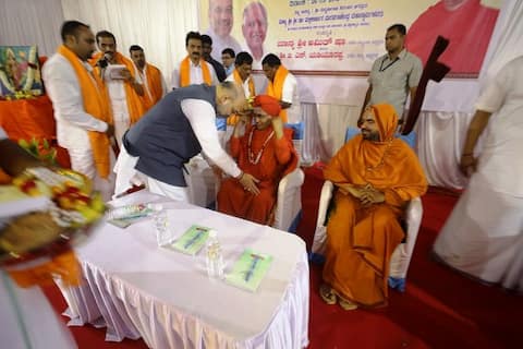 BJP National President Amit Shah visited Bekkinakal Mutt and took blessings of Pujya Swami ji Manmaharaja Niranjan Jagadguru Sri Sri Mallikarjuna Murugharajendra Mahaswamiji (26 March 2018). PIC/Amit Shah Twitter account.