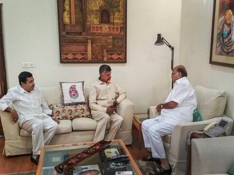 New Delhi: Chief Minister of Andhra Pradesh and Telugu Desam Party President N. Chandrababu Naidu meets NCP President Sharad Pawar, in New Delhi, Sunday, May 19, 2019. TDP leader Ram Mohan Rao is also seen. (PTI Photo)