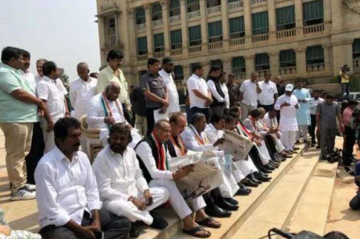 Image: Congres MLAs protesting outside Vidhan Soudha in Bengaluru