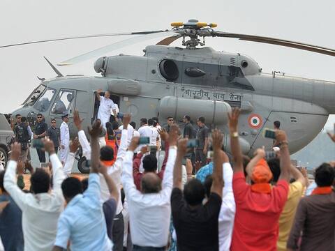 PM Narendra Modi greets Bharatiya Janata Party (BJP) supporters after landing in an Indian Air Force helicopter. Photo: File