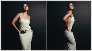 Alia Bhatt arrived in a stunning strappy white gown with a satin finish, accessorised with a chic statement belt, minimal jewellery, and a classy white hand-held bag. She styled her hair in a neat bun, complementing the look with smoky eyes and nude lips, creating a perfect blend of sophistication and glamour.