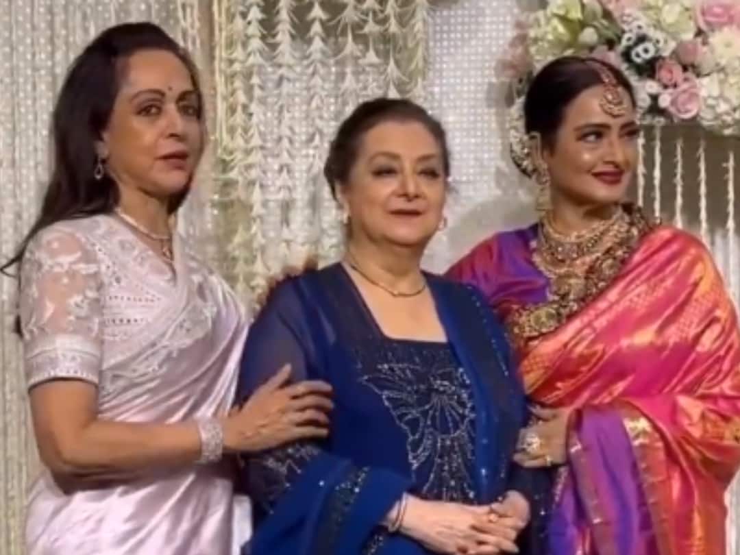 A video shared on social media, where Saira Banu can be seen posing with Hema Malini and Rekha, is doing the rounds on the internet. Rekha greeted Saira Banu with an extended hug, encouraging her to stand for group photographs. Talking about their outfits, Hema Malini could be seen in a cream silk saree, while Rekha opted for a pink and golden saree with a blue border adorned with heavy jewellery, maang tika and a gajra. On the other hand, Saira Banu looked charming in a navy blue salwar kameez.
