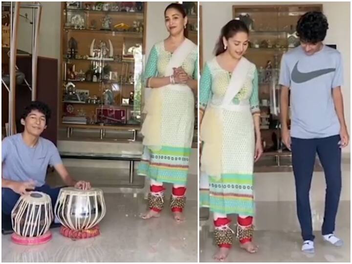 The video started with Madhuri Dixit matching her dance steps with the rhythm of the Tabla that her son was playing.