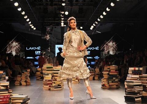 Going Indian for his inspiration, Singh called his collection 'The Punjabi Suit' and gave it some high tech futuristic treatment. Making a show stopping entry was Jacqueline in a shimmering jacket, simple shirt, crimped crushed flouncy skirt over cropped pants. "It was really fun walking for the designer. I am a huge fan of his work. He makes elegant, chic yet wearable clothes and I can wear these designs every single day. I am honoured to be here," said the actress at the post show conference area. However, the designs were no where close to the humble Punjabi outfit that are seen in the fields of the state. The fabrics were far from the conventional ones used for the popular dress of Punjab. Instead, Singh worked with paper, silk, linen and cotton all woven in-house and gave them a washed organic feel. To present some more intriguing innovations, the designer went for bold retro off-kilter stripes, cross hatch grainy textures and ikats that revealed an irregular aesthetic. The colour choice was very earthy with shades of rocks, wood and mountain desert hues along with a profusion of stripes making a pleasant appearance on the ramp. The silhouettes were the highlight of the collection as hints of men's tailoring was apparent in many of the ensembles with the cropped pants as the recurring style for both men and women. To add a slight nostalgic feminine touch, there were influences from school girl uniforms and of course the iconic Punjabi salwar kameez. The detailing comprised abundant hand stitching with the 'worn out' effect that revealed on oversized shape.