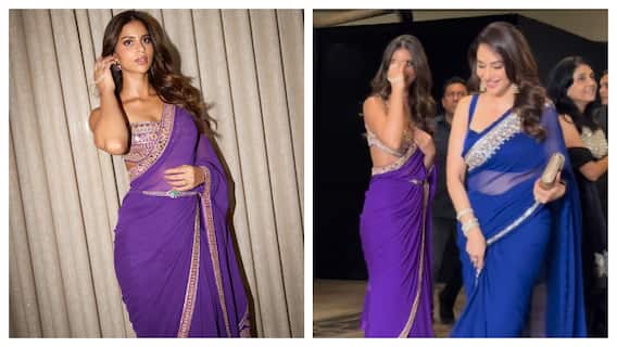Suhana dazzled in a purple saree adorned with golden sequin lace, paired with a bralette-style top featuring intricate golden embroidery. She draped the saree elegantly, letting the pallu fall gracefully over her shoulder and cinching it at the waist with a belt. Glamorous makeup completed her look. Madhuri, meanwhile, impressed in a striking blue saree.
