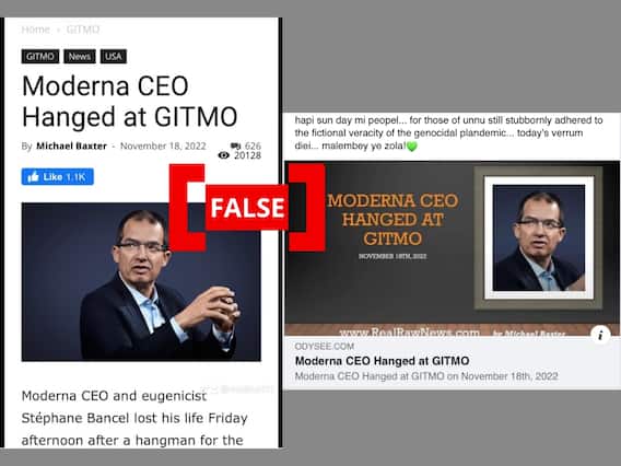 On searching for the headline “Moderna CEO hanged at GITMO” online, we found that the fake news website Real Raw News had published the article on November 18, 2022. The article referred to Bancel as an eugenicist and a pharmaceutical mogul. It claimed that Bancel was executed by the “U.S. Navy Judge Advocate General’s Corps.” It does not specify why Bancel was allegedly arrested or executed, except for claiming Moderna’s COVID-19 vaccine was a “death shot.”