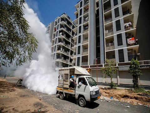 Ahmedabad: Workers fumigate near a residential complex during a nationwide lockdown to limit the spreading of coronavirus, in Ahmedabad, Sunday, March 29, 2020. (PTI Photo)
