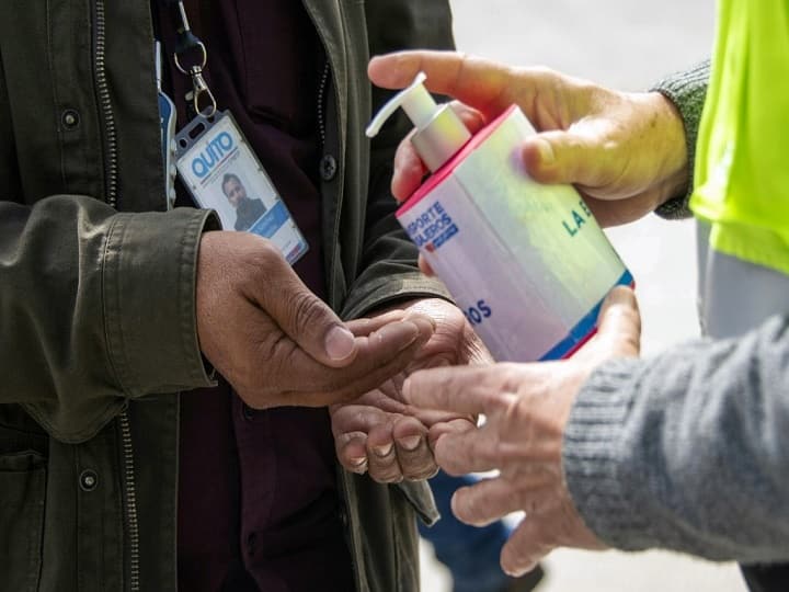 Bus passengers are given gel alcohol, as a preventive measure against the spread of the COVID-19 Coronavirus, at a transfer station in Quito, on March 13, 2020. (Photo by Rodrigo BUENDIA / AFP)