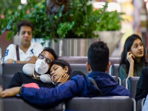 Mumbai: A man wearing a mask as part of preventive measures for the deadly coronavirus, takes a nap at an airport in Mumbai. / (PTI Photo/Kunal Patil)