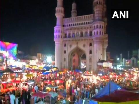 People can be seen thronging the famous night bazaar in Hyderabad's Charminar ahead of Eid ul-Fitr as the shops have been granted permission by the Telangana government to all the shop vendors and others to remain open for 24 hours.