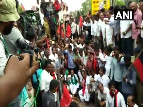 Coimbatore (Tamil Nadu) [India] April 3 (ANI): Opposition parties led by Dravida Munnetra Kazhagam (DMK) on Tuesday stopped a train in Coimbatore demanding the formation of Cauvery Management Board.