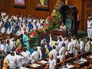 Karnataka BJP staged a protest on the state Assembly premises against the Congress over its alleged failure to fulfil the five poll promises that it had made during the campaign. The protests in the lower house during the pre-lunch session led to its adjournment twice. Former Chief Minister B S Yediyurappa, BJP state president Nalin Kumar Kateel, and BJP MP D V Sadananda Gowda joined hundreds of BJP workers at Bangalore's Freedom Park to protest against the government, reported news agency PTI.