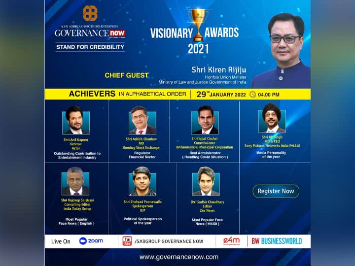 New Delhi: On January 29, 2022, Governance Now a platform for analysis of public policy and governance from the house of Sri Adhikari Brothers will honour achievers with Visionary Awards of 2021 in a virtual webinar attended by thousands of followers. Register now to attend the award ceremony https://us06web.zoom.us/webinar/register/WN_-6plO0GYRgSdCcfqT3_OGQ Hon’ble Union Minister, Law, and Justice, Government of India, Shri Kiren Rijiju, will present Governance Now, Visionary Awards to 7 exclusive dignitaries in alphabetical order in the following categories: 1. Outstanding Contribution to Entertainment Industry-Shri Anil Kapoor, Veteran Actor 2. Regulator, Financial Sector-Shri Ashish Chauhan, MD, Bombay Stock Exchange 3. Best Administrator, Handling Covid-19 Situation-Shri Iqbal Chahal, Commissioner, Brihanmumbai Municipal Corporation 4. Media Personality of the Year- Shri NP Singh, MD & CEO, Sony Entertainment Pictures Networks, India Ltd 5. Most Popular Face News (English)- Shri Rajdeep Sardesai, Consulting Editor, India Today Group 6. Political Spokesperson of the Year- Shri Shehzad Poonawala 7. Most Popular Face News (Hindi)- Shri Sudhir Chaudhary, Editor, Zee News The Awardees have been chosen after rigorous screening by an expert panel after multiple rounds of experts’ meetings. Governance Now, a participatory platform for analysis of public policy and governance engages with experts from cross-sections of society and has created niche credibility amongst the policymakers. Speaking on the occasion, Markand Adhikari, Chairman and Managing Director, SABGROUP said, "Though I have kept myself out from the entire process, our Panel of Experts have adhered to the best processes and only the best achievers are being felicitated as Governance Now stands for credibility and high standards of journalism.” The event will be broadcasted live on Zoom, SABGROUP Governance Now Digital platform (www.governancenow.com), Exchange for Media & BW Businessworld platforms.