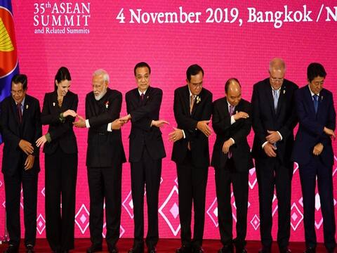 (From L to R) Cambodia's Prime Minister Hun Sen, New Zealand's Prime Minister Jacinda Ardern, India's Prime Minister Narendra Modi, China's Premier Li Keqiang, Thailand's Prime Minister Prayut Chan-O-Cha, Vietnam's Prime Minister Nguyen Xuan Phuc, Australia's Prime Minister Scott Morrison and Japan's Prime Minister Shinzo Abe prepare to pose for a group photo during the 3rd Regional Comprehensive Economic Partnership (RCEP) Summit in Bangkok on November 4, 2019, on the sidelines of the 35th Association of Southeast Asian Nations (ASEAN) Summit. (Photo/ AFP)