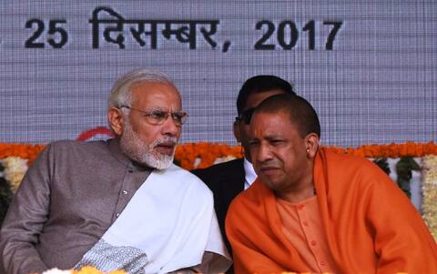 India Prime Minister Narendra Modi (L) talks with Uttar Pradesh Chief Minister Yogi Adityanath during the inauguration of a section of Delhi Metro in Noida, 25 kms east of New Delhi on December 25, 2017. FILE PIC/AFP.