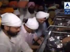 Amritsar: Delhi Chief Minister and Aam Aadmi Party national convener Arvind Kejriwal cleaned utensils at a community kitchen along with other party leaders, in order to compensate for his party's political gaffe after the party's youth manifesto carried a picture of the shrine along with a broom which is AAP's election symbol.