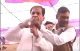 Seeing him praising PM Modi, one of the party workers standing behind him attempted to snatch the mic out of his hands but the 'adamant' leader didn't give up until he finished his brief speech.