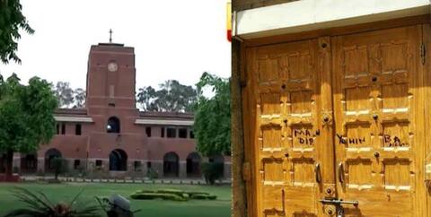 New Delhi: Even two days after unidentified men smeared communal graffiti, Delhi University's St. Stephen's College is yet to file an official complaint, a varsity official confirmed on Sunday. Right: sunilupdate/ Left: ABP News It was on Friday that students and others found the door of the college chapel scribbled with the oft-repeated communal slogan "Mandir wahin banayenge" (we shall build the temple there only) and a cross at the graveyard written over with "I am going to hell". "We have not received any complaint from the college yet. We can only act once the college files an official complaint," Neeta Sehgal, officiating Proctor at the Delhi University, told media. No official statement has been issued by the college administration so far either. The act of defacement has over these two days been condemned by all major student groups, including the Akhil Bharatiya Vidyarthi Parishad (ABVP), which is affiliated with the Rashtriya Swayamsevak Sangh (RSS) which trenchantly favours the construction of a Ram Mandir in Ayodhya in place of the now destroyed Babri Masjid. The All India Students' Association (AISA), affiliated with the Communist Party of India (Marxist-Leninist), also spoke against the incident of defacement on Friday and urged the students to "defeat the attempts to communalise students on religious lines". The Congress-affiliated National Students' Union of India demanded an enquiry into the matter attributing the act to "right-wing elements" with "fake nationalism".