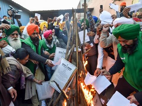 Protesting farmers burnt copies of the contentious farm laws to mark the festival of Lohri on Wednesday, while a farmer union gave a call for massive mobilisation of people from all districts within a radius of 300 kilometres of Delhi for the proposed 'Kisan Parade' on January 26. (Image: PTI)