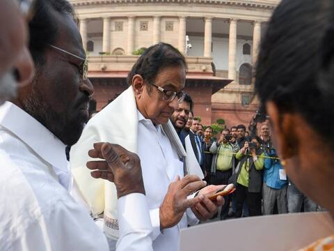 India's former finance minister Palaniappan Chidambaram (C) uses his mobile as he arrives to attend an event at the Parliament House in New Delhi on December 5, 2019.- Indian ex-finance minister Palaniappan Chidambaram was granted bail on December 4, 106 days after his dramatic arrest on corruption charges that he says are part of a government witch-hunt against political opponents. PIC/AFP.