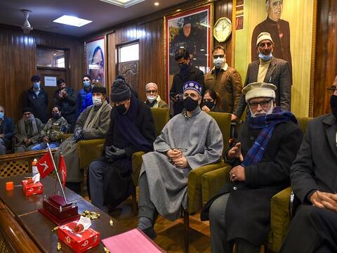 NC President Farooq Abdullah, Vice President Omar Abdullah and other senior leader during a meeting with party workers to celebrate the results of DDC and municipal elections. (Image: PTI)