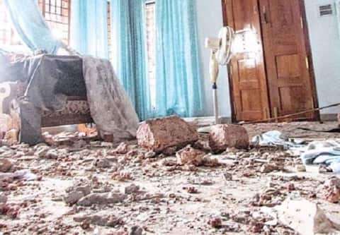 Concrete debris near a damaged building on the temple premises in Kollam, Kerala. (PTI)
