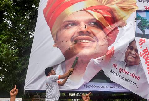 Maratha Kranti Morcha protesters vadalise a poster of Maharashtra Chief Minister Devendra Fadnavis during their statewide bandh in Thane. Photo: PTI