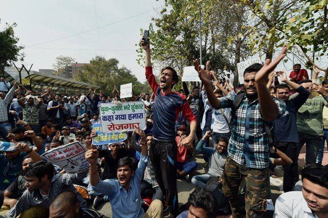 Staff Selection Commission (SSC) aspirants stage a protest demanding CBI probe into the alleged paper leak outside SSC building, at Lodhi Road in New Delhi on February 28.