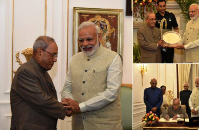Modi hosts dinner for outgoing President Pranab Mukherjee, presents memento