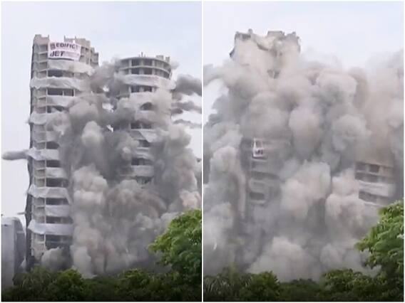 New Delhi: The Supertech Twin Tower, Apex and Ceyan, in Noida's Sector 93A was razed to rubble in faction of seconds on Sunday afternoon amid major cloud dust. The 100-metre tall skyscraper borne out of corruption was demolished using the waterfall implosion technique by Mumbai-based Edifice Engineering tasked with safely pulling down the structures, the tallest buildings yet in the country to be detonated. Following Supreme Court's order that had found its construction within the Emerald Court Society premises in violation of norms, the twin towers, taller than Qutub Minar, were brought down using 3,700 kilograms of explosives plant all over the building.