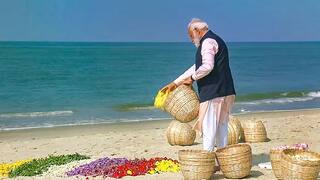 Prime Minister Narendra Modi on Sunday visited Arichal Munai point in Tamil Nadu's, which is said to be the place from where the Ram Setu started and paid floral tributes at the seashore.