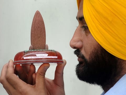 Indian artist Harwinder Singh Gill displays a model of the Flame of Liberty memorial at Jallianwala Bagh in Amritsar. FILE PIC/AFP.