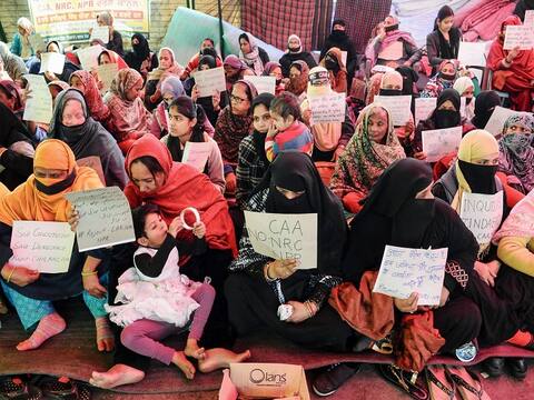 Women and children hold placards during a silent protest against CAA and NRC at Shaheen Bagh in New Delhi. (Image: PTI)