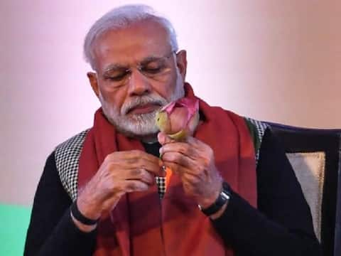 Indian Prime Minister Narendra Modi holds a lotus flower which is the symbol of Bharatiya Janata Party (BJP) on the first day of the two-day Bharatiya Janata Party national convention in New Delhi on January 11, 2019. (Photo by Money SHARMA / AFP)
