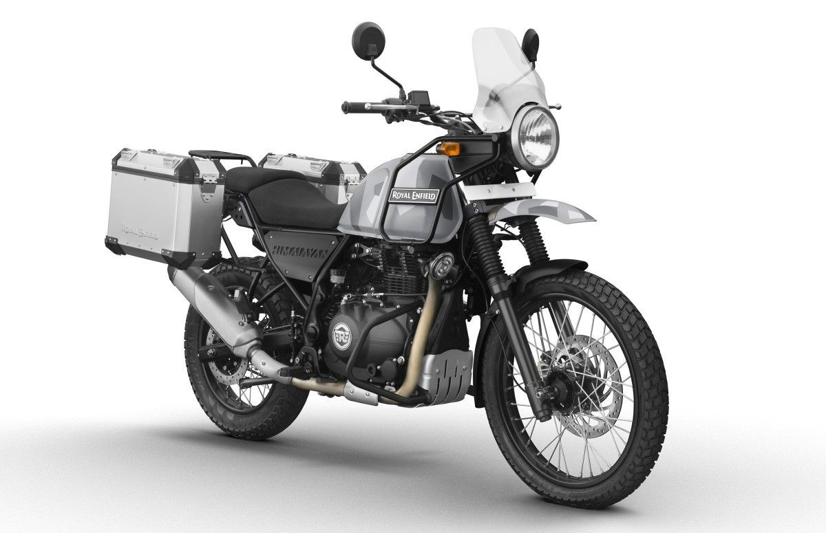 The Explorer Kit on the Himalayan Sleet consists of pre-fitted 26-litre water resistant aluminium panniers, pannier mounting rails, aluminium handlebar with cross brace for added strength, handlebar end weights for additional protection and a powder-coated large engine guard. This kit will come with a two year warranty.