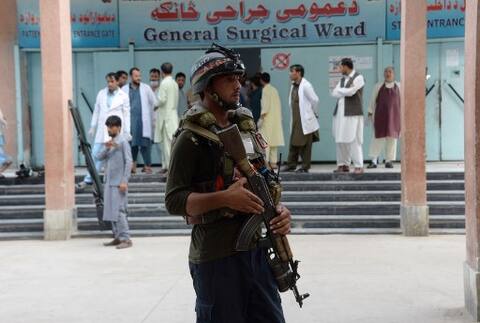 An Afghan policeman stands as unseen volunteers carry an injured on a stretcher to a hospital, following an attack that targeted a parliamentary election rally in the Kama district of the eastern province of Nangarhar, in Jalalabad on October 2, 2018. / AFP PHOTO / NOORULLAH SHIRZADA