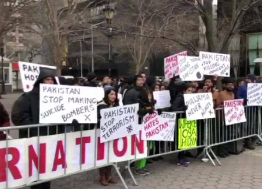 Anti-terrorism protest at UN demands action against Pakistani terror sponsors, JeM chief