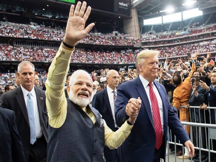 US President Donald Trump and Indian Prime Minister Narendra Modi attend "Howdy, Modi!" at NRG Stadium in Houston, Texas, September 22, 2019. - Tens of thousands of Indian-Americans converged on Houston on Sunday for an unusual joint rally by Donald Trump and Narendra Modi, a visible symbol of the bond between the nationalist-minded leaders. With many in the crowd decked out in formal Indian attire or the signature saffron of Modi's Bharatiya Janata Party, the event kicked off in a football stadium with a Sikh blessing, boisterous bhangra dancing and, in a nod to local customs, cheerleaders in cowboy hats. (Photo by SAUL LOEB / AFP)