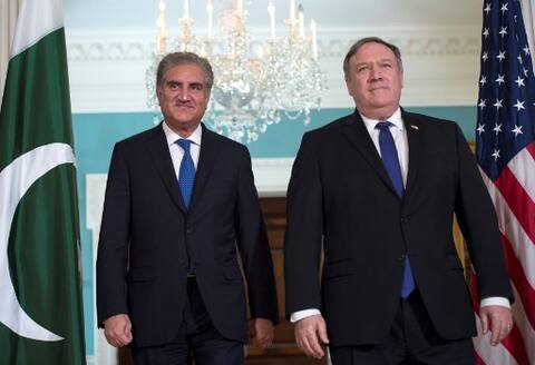 US Secretary of State Mike Pompeo (R) meets with Pakistani Foreign Minister Shah Mehmood Qureshi at the US State Department in Washington, DC on October 2, 2018. / AFP PHOTO / ANDREW CABALLERO-REYNOLDS