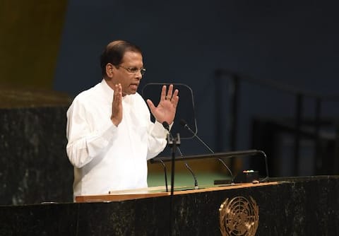 Maithripala Sirisena President of Sri Lanka, addresses the Nelson Mandela Peace Summit September 24, 2018 a day before the start of the General Debate of the 73rd session of the General Assembly at the United Nations in New York. - The focus of the Nelson Mandela Peace Summit is on Global Peace in honour of the centenary of the birth of Nelson Mandela. (Photo by Don EMMERT / AFP)