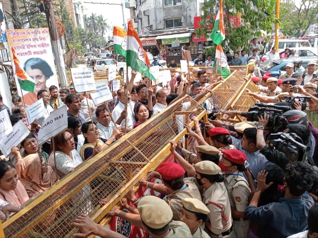 Hundreds of Congress workers and supporters staged a protest in Guwahati in Assam on Thursday After a Gujarat court held Congress MP Rahul Gandhi guilty in a 2019 defamation case and sentenced him to two years imprisonment.
