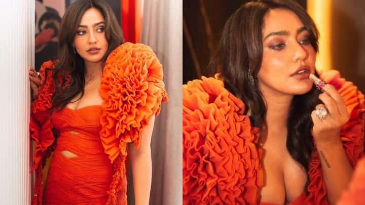 Neha Sharma brings high-fashion drama in a bold orange ruffled gown.