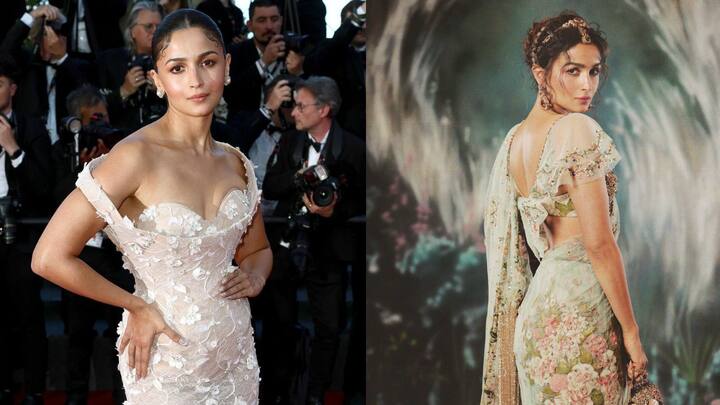 1. Ethereal Look At Cannes: Alia Bhatt made breathtaking debut at Cannes this year wearing a stunning off-shoulder gown that gave her a whimsical charm. The delicate gown had floral embroidery on the bodice and cascading voluminous ruffled tiers on the hem. The fitted outfit hugged her figure gracefully while the train added a regal flair. The actress opted for a minimal jewellery look that made her attire steal the spotlight. (Image Source: Twitter/@pradapearll)