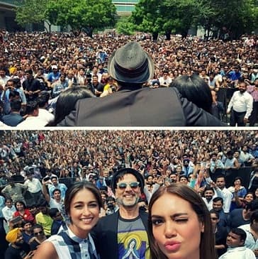 Bollywood actors Esha Gupta, Akshay Kumar and Ileana D'Cruz during the promotion of film Rustom at Amity University in Gurgaon. Movie will release on August 12
