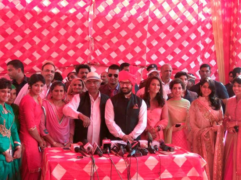 Bhiwani: Bollywood actor Aamir Khan on Sunday attended the wedding ceremony of international wrestler Geeta Phogat in her ancestral village near this Haryana town and termed his upcoming film "Dangal", based on her and her family's life, his wedding gift to her. "Dangal' is my wedding gift to Geeta," Aamir said, adding that he would have gifted her the bridal gown but for "traditional reasons". "It is traditionally given by the maternal uncle," he said. Sporting a red colour Haryanvi turban and a half jacket, Aamir, who plays the role of Mahavir Singh Phogat, the father of medal-winning athletes Geeta and her sister Babita, in his next film "Dangal", arrived in the Balali village to wish Geeta and her family. Meanwhile, Geeta, who married fellow wrestler Pawan Kumar, took an extra eighth 'phera', which she dedicated to the "Beti Bachao, Beti Padhao" initiative, intended to curb the incidence of female foeticide in the country, which has led to a skewed sex ratio. Haryana is one of the worst-affected. A recently-released song of "Dangal" showcases the prolonged training sessions undergone by Geeta and her sister on the behest of their father, who is shown to be extremely strict with them in their training. "Dangal", produced by Aamir Khan, Kiran Rao & Siddharth Roy Kapur under Disney and Aamir Khan Productions, is directed by Nitesh Tiwari and is slated to release on December 23.